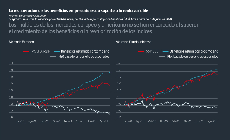 La pregunta ahora es ¿queda recorrido a los mercados? Hay razones para creer que la tendencia alcista sigue intacta, dado que la recuperación económica goza aún de recorrido, pero las valoraciones parecen estar en un punto de agotamiento y, en consecuencia, los mercados son más vulnerables frente a las sorpresas negativas. Identificamos cuatro riesgos potenciales en los próximos meses: un nuevo repunte de la crisis eléctrica que provoque preocupaciones sobre la inflación y un menor crecimiento, una compresión de los márgenes empresariales por el aumento de los precios de producción, un deterioro de los problemas de liquidez en el sector inmobiliario chino y una posible agitación en el Congreso de EE.UU.