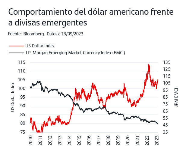 En el segundo semestre de 2022 el dólar Index, que mide el valor del dólar estadounidense con relación a una cesta de monedas extranjera, alcanzó niveles máximos y desde entonces se ha ido depreciando. Las monedas emergentes, por el contrario, actualmente se encuentran en un nivel bastante infravalorado (EMCI Index en el gráfico). En el corto plazo es de esperar que, dadas las mejores expectativas de crecimiento y una posición fiscal bastante saneada en comparación con Estados Unidos, el movimiento sea de apreciación frente al dólar americano.
