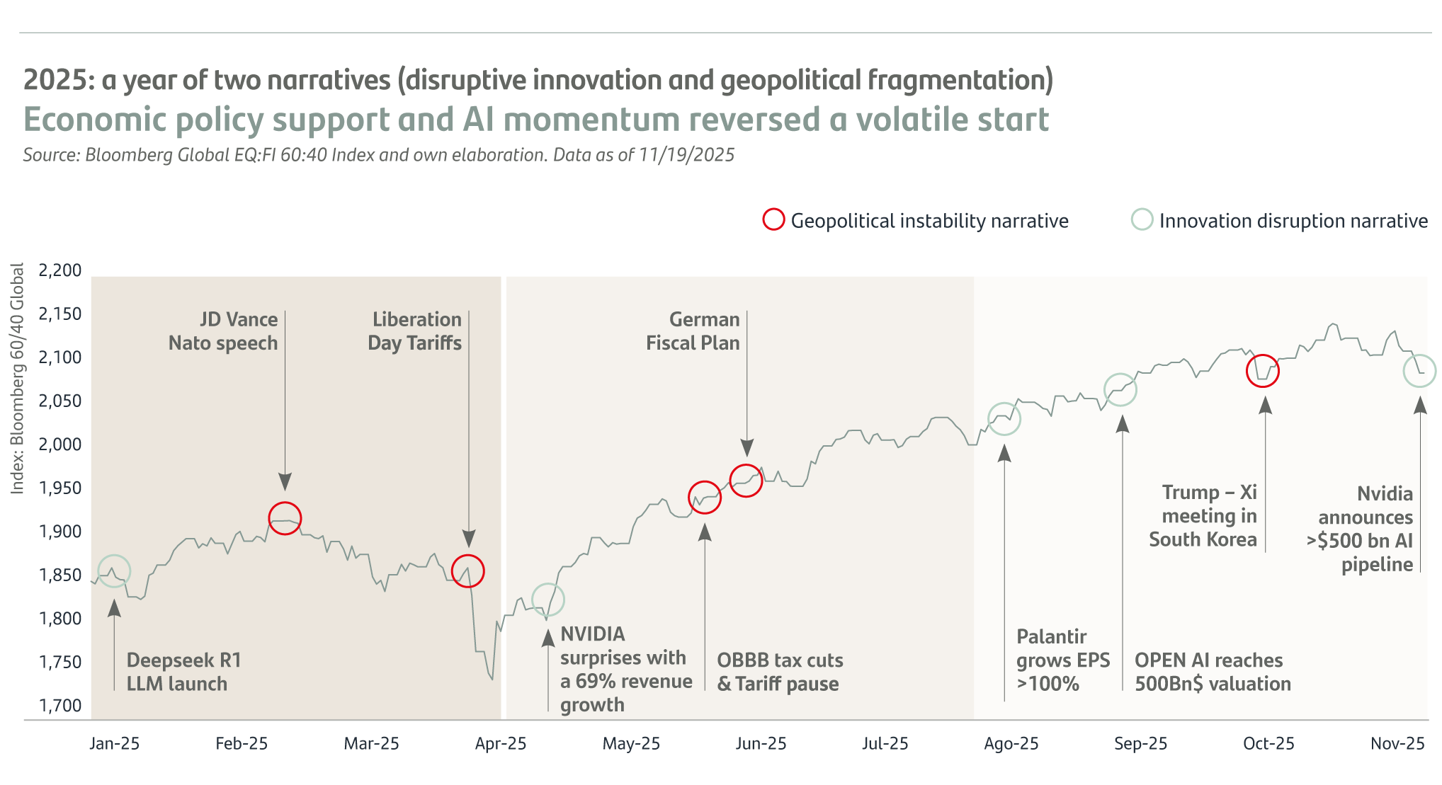 As the year advanced, a second narrative gained momentum. The innovation cycle, fueled by record AI investment, gradually offset geopolitical stress. NVIDIA’s exceptional results in May, with a 69% surge in revenues, the record AI pipeline announced in November, and OpenAI’s valuation surpassing $500 billion later in the year, reinforced how innovation was driving profits and confidence. Fiscal support in the U.S. and Germany amplified this shift, and markets steadily recovered. As illustrated in the chart below, these alternating narratives defined market performance: volatility around policy shocks gradually gave way to renewed optimism as technological progress and capital spending took the lead. Even the Trump–Xi meeting in Seoul in late October — a symbolic reminder of geopolitical rivalry — failed to derail the uptrend.